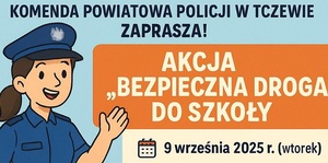 AKCJA „BEZPIECZNA DROGA DO SZKOŁY”, która odbędzie się w dniu 9 września 2025 roku, w godzinach 10:00- 13:00, na Placu Marszałka Piłsudskiego 1, przed Urzędem Miejskim w Tczewie