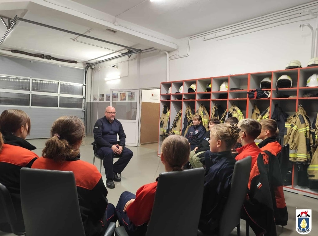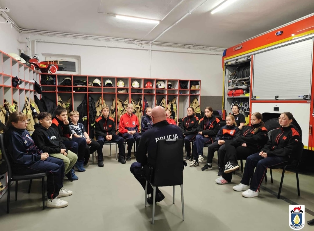 Dzielnicowy z Komisariatu Policji w Pelplinie spotkał się z członkami Młodzieżowej Drużyny Pożarniczej. Rozmowa dotyczyła bezpieczeństwa w codziennym życiu, zagrożeń w Internecie oraz służby w Policji.