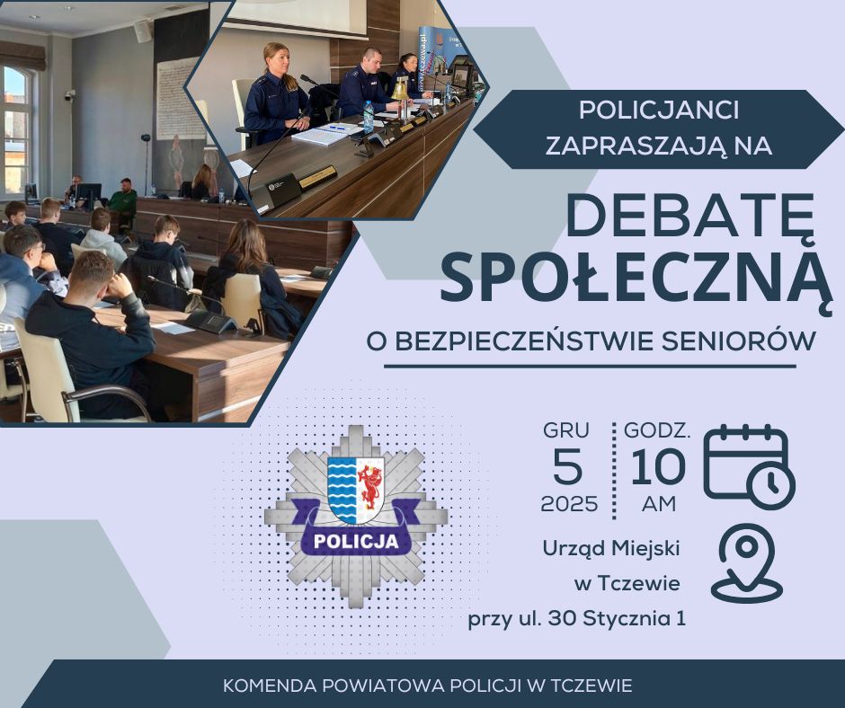 Policjanci z Komendy Powiatowej Policji w Tczewie zapraszają wszystkich mieszkańców na otwartą debatę społeczną dotyczącą bezpieczeństwa seniorów. Spotkanie odbędzie się 5 grudnia 2025 roku o godzinie 10:00 w Urzędzie Miejskim w Tczewie przy ul. 30 Stycznia 1. Debata wpisuje się w cykl działań mających na celu zwiększenie świadomości mieszkańców i wzmocnienie współpracy pomiędzy Policją a lokalną społecznością.